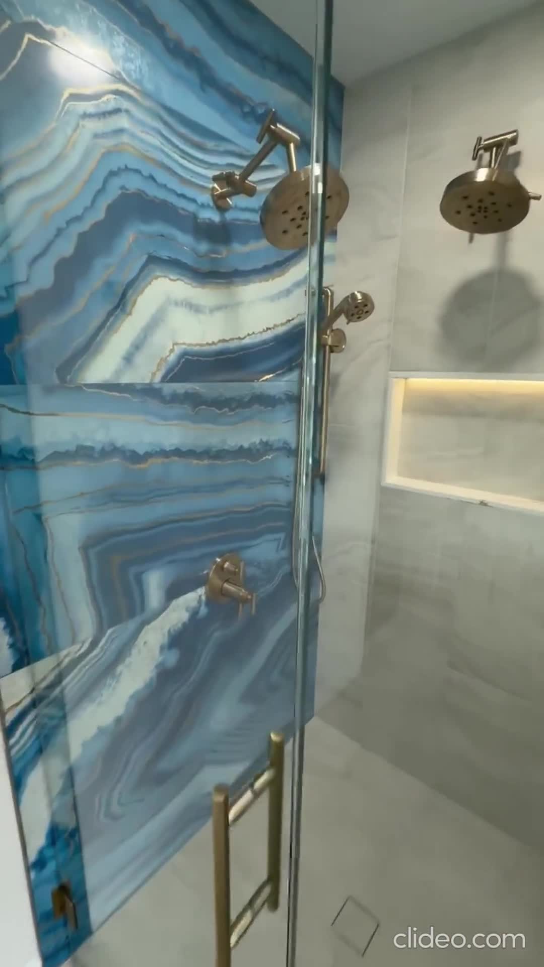 This updated bathroom showcases stunning blue contrasting colors, highlighted by marbled blue accents in the shower that seamlessly complement the coordinating custom cabinets. Featuring a luxurious soaking tub and dual sinks, the space is designed for both comfort and style. Natural light fills the room, enhancing the vibrant hues and creating a serene atmosphere.