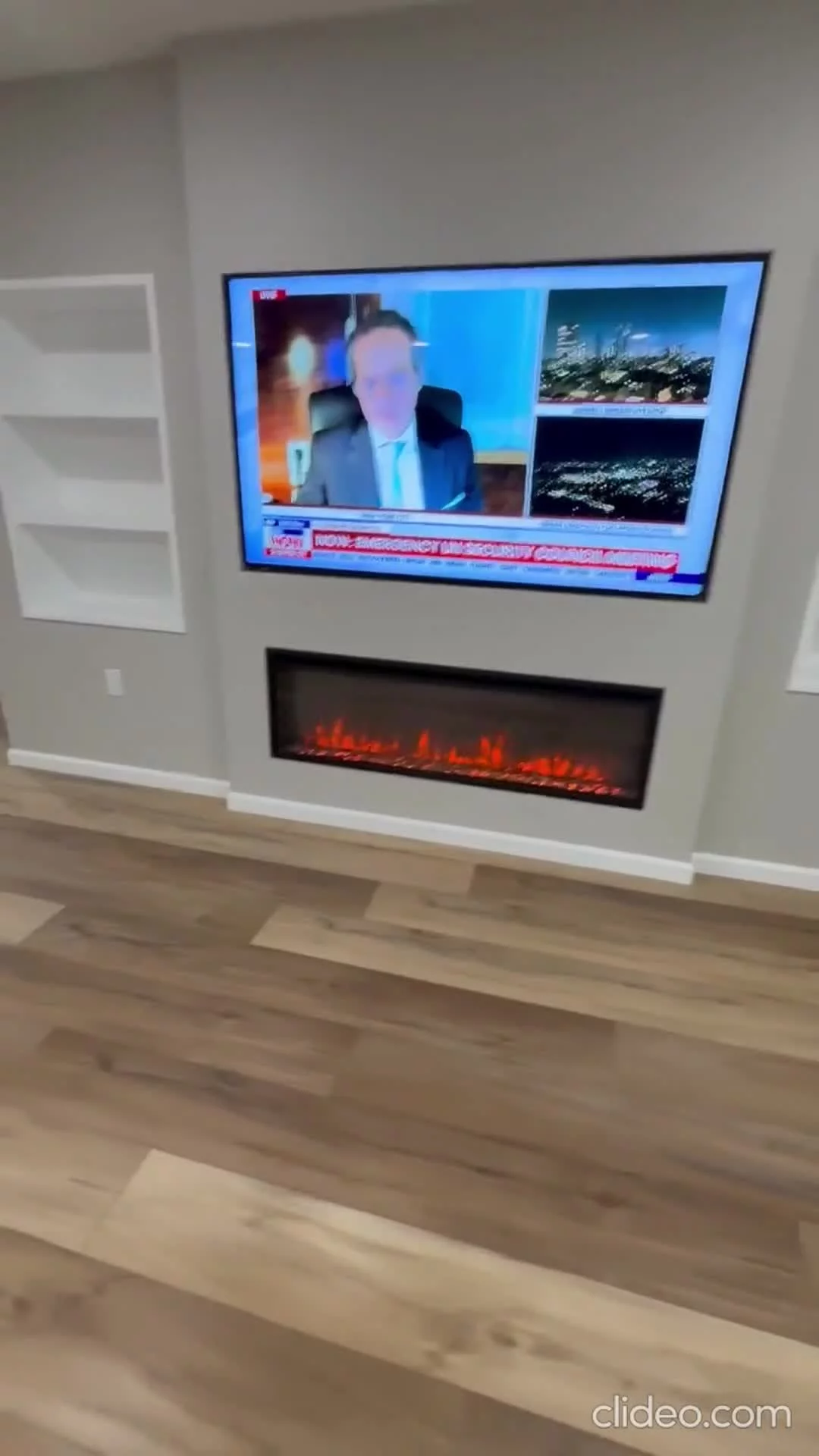 The centerpiece of the basement is a fireplace framed by a custom TV entertainment accent wall, creating a warm and inviting atmosphere perfect for gatherings. The expansive open area offers ample space for entertaining and flexible use, accommodating a variety of furniture arrangements.