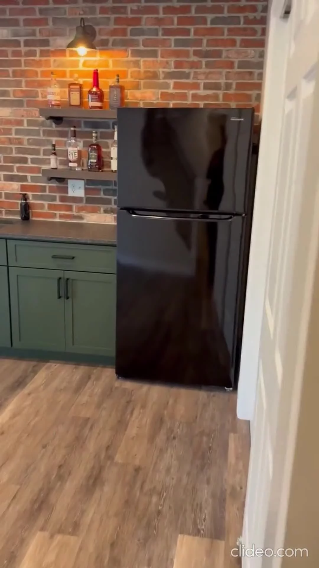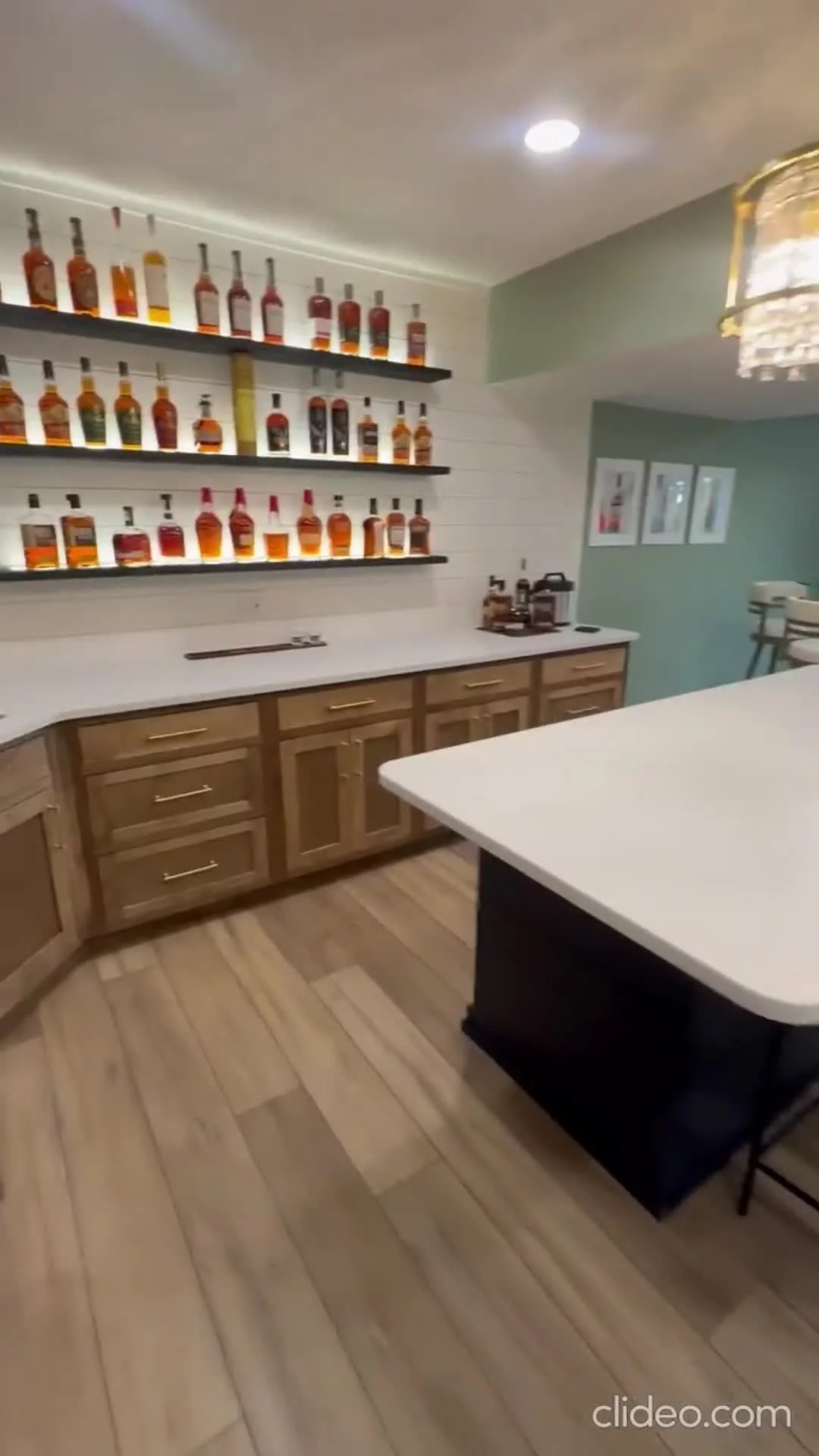 This remodeled basement combines style and functionality with stunning exposed brick walls that add character throughout the space. The custom bar features a spacious island, ideal for entertaining guests, while the dedicated TV area provides the perfect setting for watching sporting games. A thoughtfully designed workout room includes custom rollout pocket storage to keep equipment organized and out of sight. Elegant chandelier lighting throughout the basement highlights the sophisticated yet inviting atmosphere, making this space both practical and visually striking.