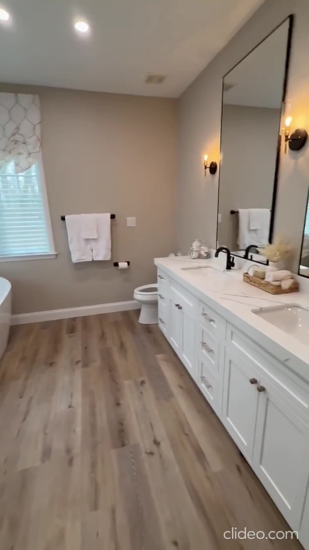 This remodeled bathroom features ample storage with custom cabinetry designed to keep essentials organized and accessible. Modern fixtures enhance the space with sleek functionality, while a unique pebble-style tiled shower floor adds a natural, textured element. The layout includes a convenient storage closet and a luxurious soaking tub, combining practicality and relaxation in one elegant space.
