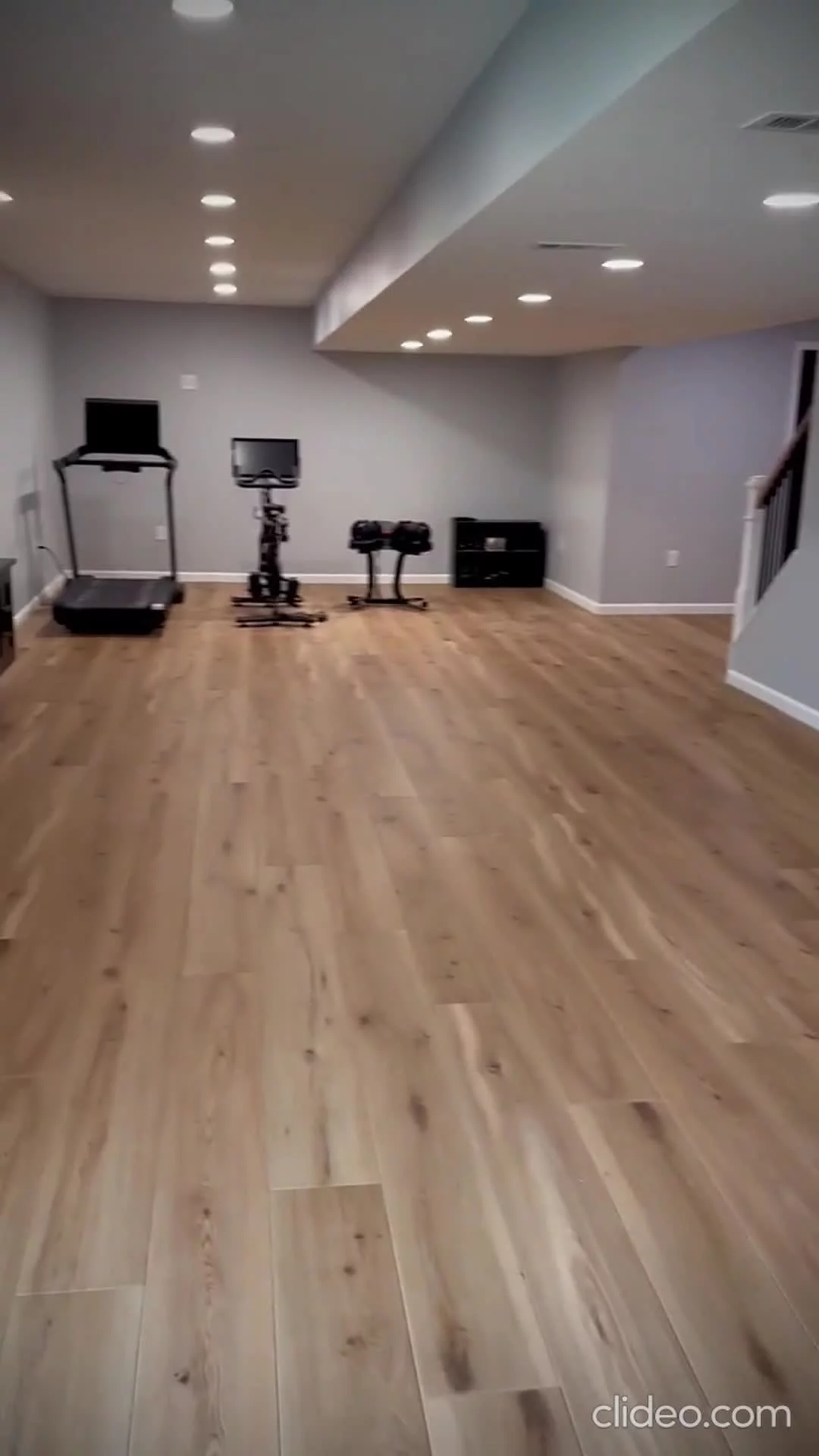 The remodeled basement offers a sophisticated and functional living area with recessed lighting throughout, providing a clean and modern ambiance. A dedicated workout space is thoughtfully integrated, allowing for convenient daily exercise within the home. The custom TV entertaining space features built-in shelving, creating an organized and stylish focal point for family and guests.